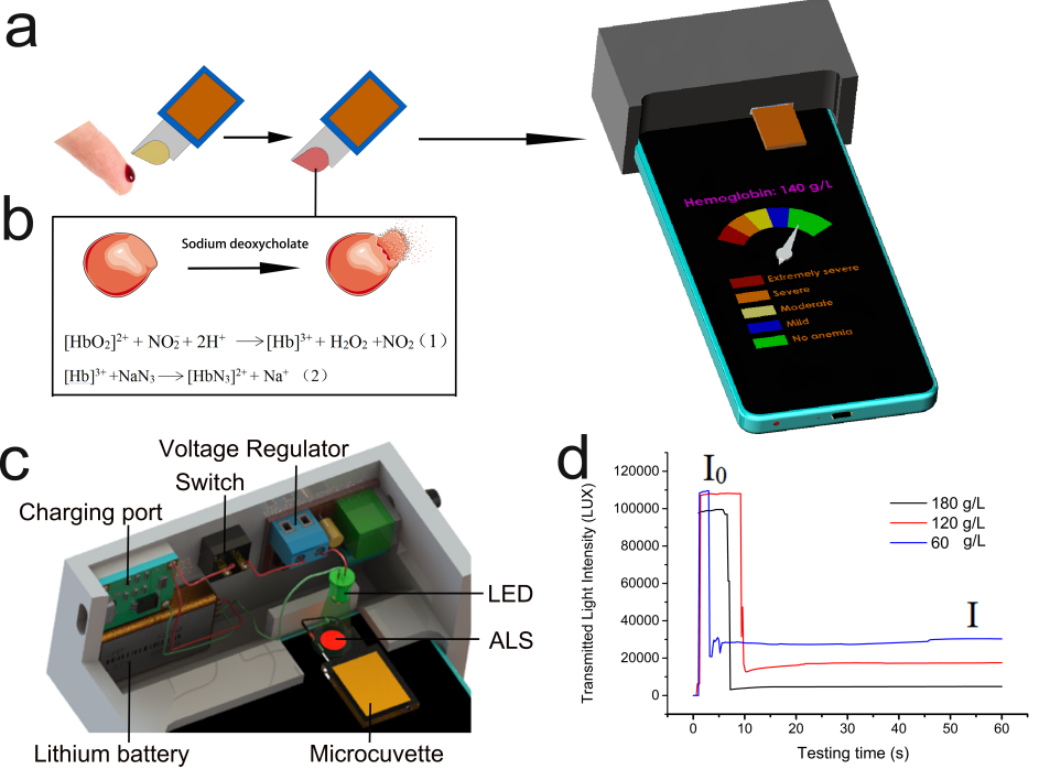 全球受贫血影响的人数超 20 亿,其中女性和儿童疾病负担最重。目前,贫血诊断需通过检测血红蛋白(Hb)水平实现,而该检测必须在医院或商业实验室中,由专业技术人员操作完成。本研究团队报道了一款适用于贫血床旁检测(POCT)的智能手机血红蛋白分析仪(SHbA),该设备具备便携、经济(成本仅 3 美元)、易操作(1 分钟内完成检测)且准确的特点,仅需一滴指尖血即可完成检测。该设备通过智能手机环境光传感器(ALS)精准测量微量比色皿中血红蛋白比色生化分析试剂的吸光度,并结合基于安卓系统的应用程序进行结果分析,最终实现血红蛋白的床旁检测。验证结果显示,智能手机血红蛋白分析仪(SHbA)的检测结果与血液分析仪的检测结果高度一致:对于静脉血样本(n=360),其贫血诊断灵敏度为 95.4%、特异度为 96.3%;对于指尖血样本(n=475),诊断灵敏度达 96.39%、特异性达 95.58%。此外,该设备在贫血高危人群(包括肿瘤化疗患者 424 例、孕妇 214 例、地中海贫血患者 208 例)的诊断及治疗指导中均表现出优异性能。值得关注的是,志愿者(n=20)自测结果表明,该设备可用于家庭场景下的贫血诊断与监测。智能手机血红蛋白分析仪(SHbA)兼具高灵敏度、高特异性、低成本、易操作的优势,在贫血的诊断与治疗中具有广泛应用前景,尤其适用于医疗资源匮乏地区的贫血高危患者。